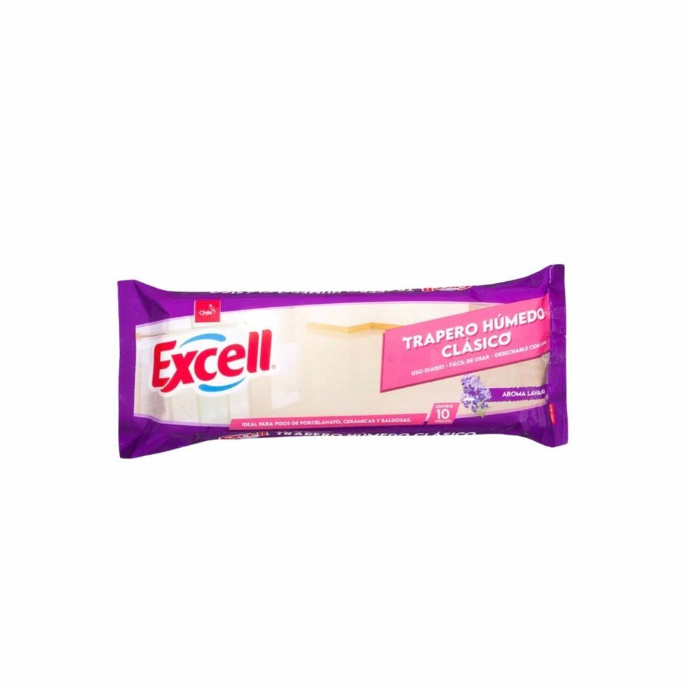 Pack de 10 traperos húmedos desechables Excell con fragancia a lavanda, diseñados para la limpieza rápida, y abrillantado de pisos en un solo paso.